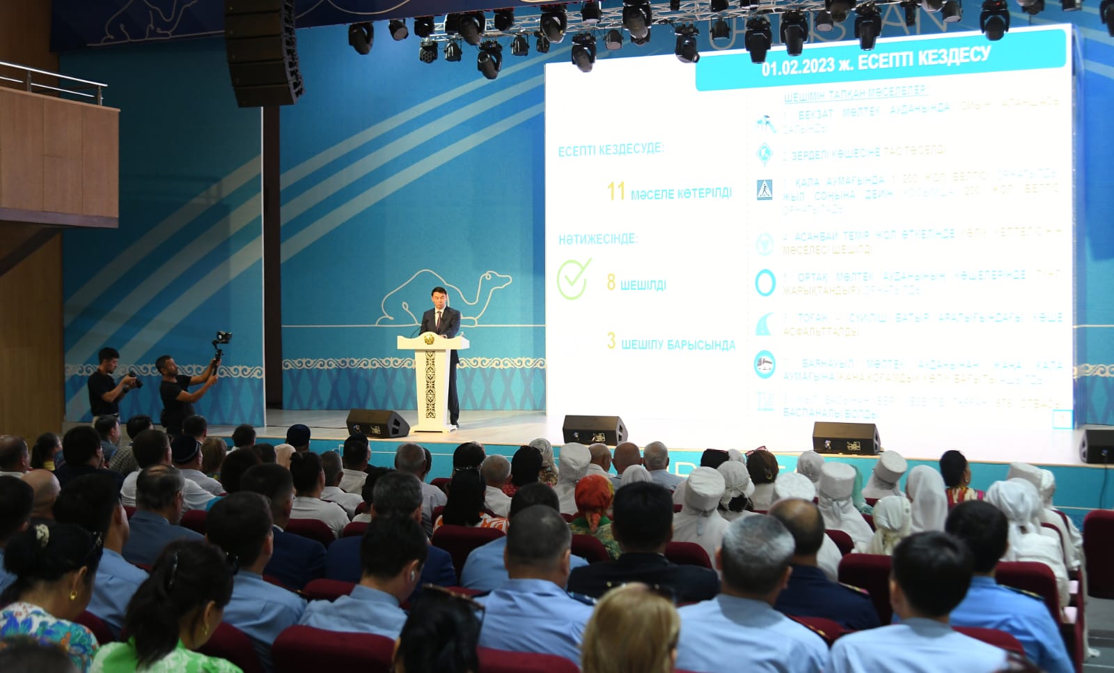 – Түркістан қаласына облыс орталығы мәртебесінің берілуі шаһардың дамуына серпін берді. Қаламызда шағын және орта кәсіпкерлік қарқынды дамуда, ол үшін әкімдік тарапынан жағдай жасалып отыр. Биыл Түркістан қаласында қосымша 2 мың жаңа шағын және орта бизнес субъектісі тіркелді. Тұрғындардың орташа жалақысы 58 пайызға өсіп, былтыр 213 мың теңгені құрады. Қала бюджетінің өзіндік кірістері соңғы 5 жылда 5 есе артып, былтыр 15 млрд. теңгеге жетті. Осы жылдың 6 айында өзіндік кірістер 11 млрд. теңгені құрады. Соңғы 5 жылда қаламызда жаңа әкімшілік-іскерлік, мәдени-рухани орталықтары, жаңа халықаралық әуежай салынды, Бекзат Саттарханов даңғылы қайта жаңартылды. Облыс орталығы болғалы бері қаламызда 163 тұрғын үй салынып, 9397 отбасы баспаналы болды. Бұдан бөлек, қазіргі уақытта 4439 пәтерлі 66 үйдің құрылысы жүргізілуде, оның ішінде биыл 59 үйді (3377 пәтер), келесі жылы 7 үйді (1062 пәтер) пайдалануға береміз деп жоспарлап отырмыз. Сонымен қатар жеке инвестиция есебінен 2700 пәтерлі 46 тұрғын үйдің құрылысы жүргізілуде, – деді Дархан Сатыбалды.